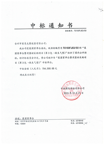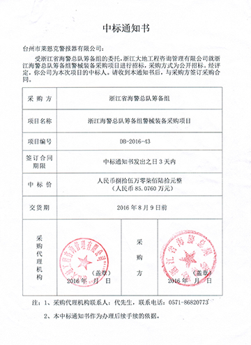 浙江省海警总队筹备组中标通知书